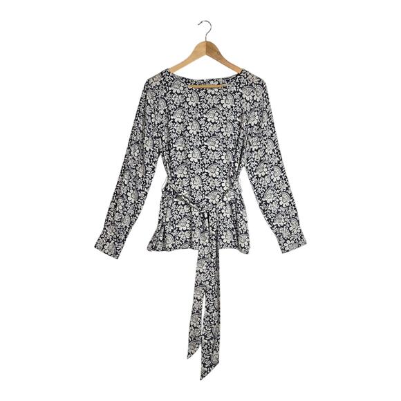 Loft Top Sz S Blue White Floral Print Back Keyhole Button Long Sleeve Tie Belt