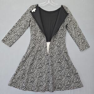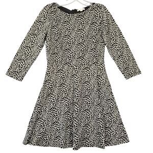 Loft Black Dress Midi Preppy Floral Fit Flare Aline 3/4 Sleeves Zip Women Size 4