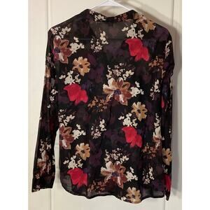Loft Black Floral Long Sleeve Lightweight Collared Button Front Blouse Petite L