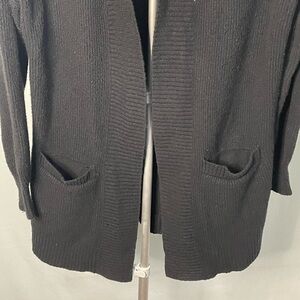 Stylish black open front cardigan with pockets. Perfect for layering.