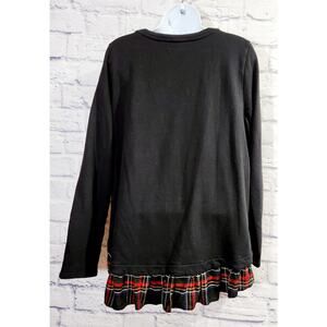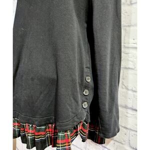 black red plaid ruffled hem, faux button side details, round neck, long sleeves, comfy, cozy, lightweight
