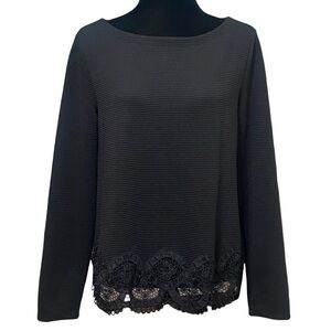 Loft black ribbed knit long sleeve top featuring a flattering boat neckline and intricate lace trim hem for a touch of whimsy and elegance. Perfect for styling with jeans or skirts for an elevated everyday look.