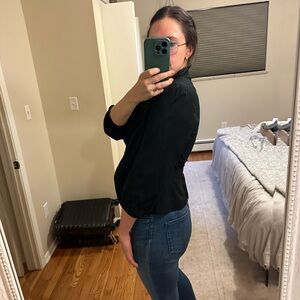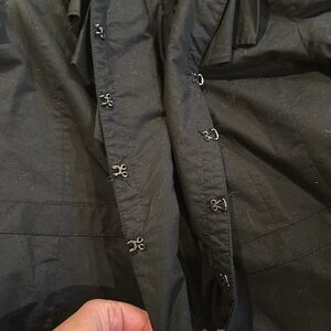 Black blazer / jacket from Loft. Unique and flattering ruffle detail. Metal clasps up the front. Slightly puffed shoulder.