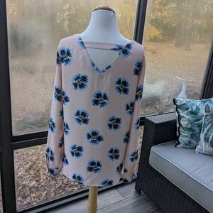 Light pink v neck dress top with dainty blue flowers. Bar v neck back as well looks so nice! Never worn. 100% polyester.