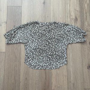 Button up lightweight blouse, round neckline, 3/4 slight bishop batwing balloon sleeves. It has animal, cheetah, leopard print. The hem at the end of sleeves have buttons, small pocket detail on the left hand side of the chest, there is an extra button sewn on the label tag.