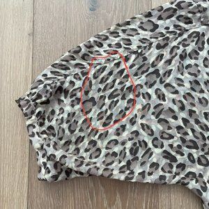 GOOD/FAIR pre-owned used condition. No stains. There are slight thread pulls in a couple of locations (see red circles in pictures). It’s hard to see as the shirt is pretty camouflaged with the animal print.