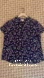 Sheer button down navy blue blouse with floral pattern. Pajama style piping detail along the buttons. Short sleeves and collar.