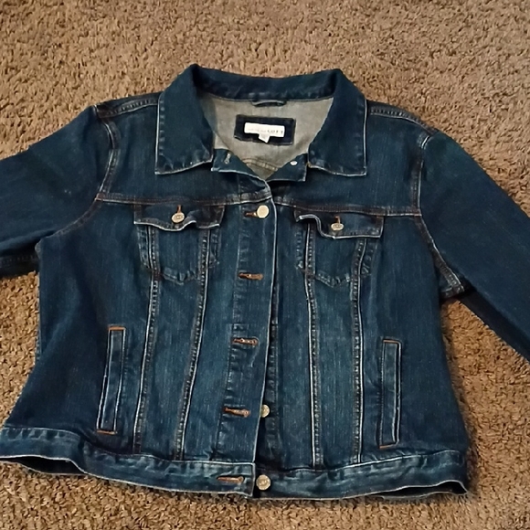 Classic dark blue jean jacket. Features button front and chest pockets. Ideal for layering.