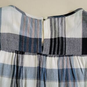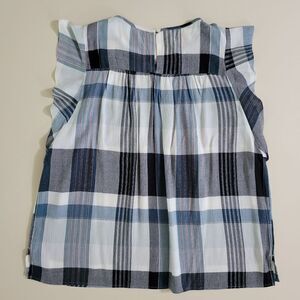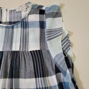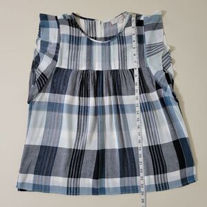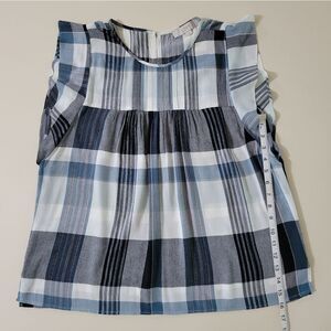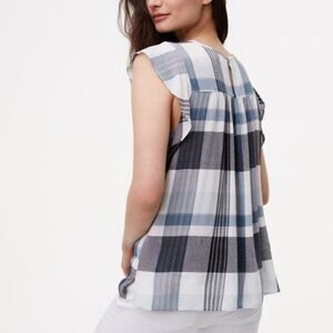 Breezy sleeveless blouse by Loft is crafted in a classic blue plaid of lightweight rayon. Give dull everyday style the bold shoulder with this ruffle-sleeved top, a comfy and effortless approach to pretty. Round neck. Excellent, new condition.
