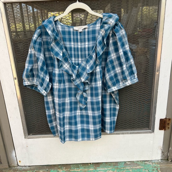 Loft Blue Plaid Ruffle Blouse