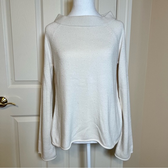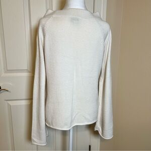 Beautiful boatneck sweater. Cream color. Super soft knit! It's a blend of acrylic, nylon, and rabbit hair. Has a very soft, almost furry texture. I love the collar that pops up a bit giving it a little bit of a 50's / retro look. Long sleeves with rolled hems. This sweater has a luxurious feel and is an awesome basic for fall and winter!