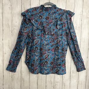 Loft Bouquet Blue Paisley Long Sleeve Ruffled Yoke Puff Sleeve Button Down Blouse