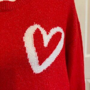 Bright red sweater with cute white heart detail. Perfect for adding a pop of color to your wardrobe. Made of 55% cotton, 22% polyester, 19% acrylic, 4% spandex. Machine washable, delicate cycle.