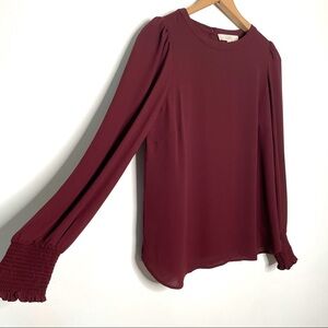 Excellent, like new condition! Deep burgundy. Thin, lightweight blouse. Rounded hem. Elastic cuffs. Size S. 19.5” armpit to armpit. 25” length.