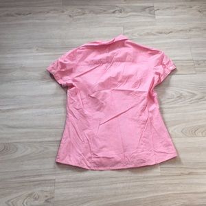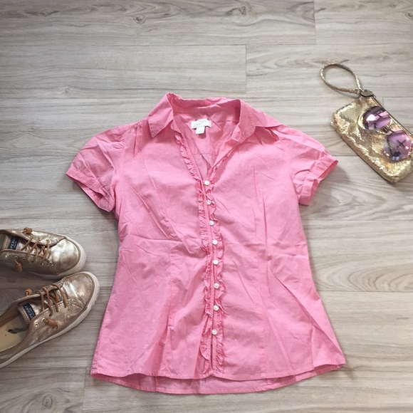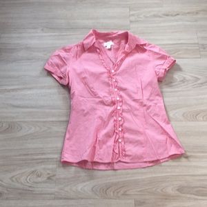 Loft Ruffle front button down. Pink stripe. Cute color and fit. 100 % cotton and light weight. One of my favorite tops. Well loved but no signs of wear. Reasonable offers accepted.