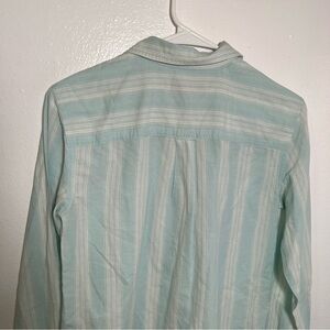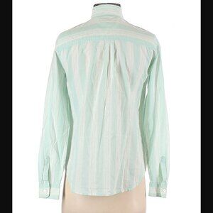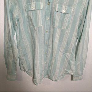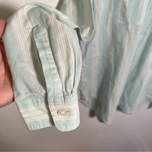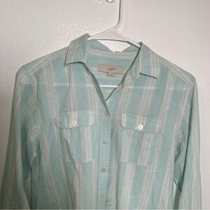 Great condition, minor wash wear. Loft. Button down shirt. Mint green color with white stripes. Semi-sheer. Long sleeve. Chest pockets with button closure. Size XS. 100% cotton. Pit to pit laying flat 19” shoulder to hem 25” Sleeve (seam to hem) 22.5”. All measurements are approximate and taken lying flat. Smoke free home. No trades, offers welcome.