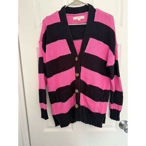 Loft Cardigan Sweater Large Women's Pink Navy Color Block Knit Oversized
