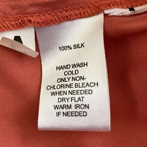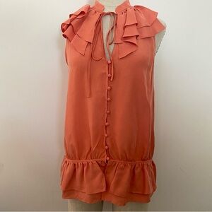 Chic coral blouse with ruffle accents. Sleeveless design and made of 100% silk. Perfect for versatile styling.