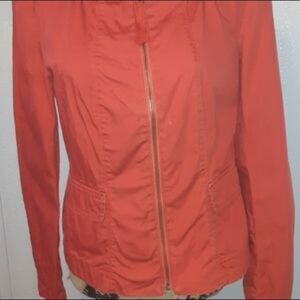 Cute tailored jacket with two front pockets, unlined, crew neck with a gathered collar, faded look and feel to this 100% cotton zip up jacket. A peplum style in the back and cap sleeves for a fitted look. Pair with a pair of jeans, tank add a peep toe heel or cute ankle bootie.