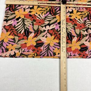Bright and cheerful Loft cotton top in size small featuring a vibrant tropical floral print in orange, yellow, pink, and red. Lightweight slub-knit cotton with 3/4 sleeves—perfect for spring and summer layering.