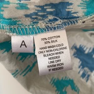 Gray sleeveless blouse with 3 functional buttons at v-neck with ruffles. Darts at bust for flattering shape. Summer weight woven cotton and silk blend. White, gray, and blue ikat pattern. Great for work or church. Can be dressed up or down. Worn alone or layered with a blazer or cardigan.