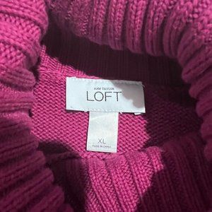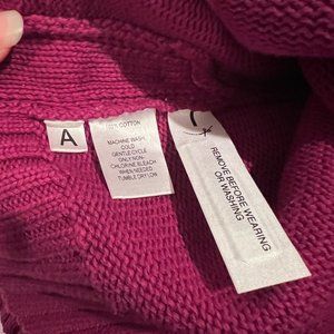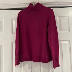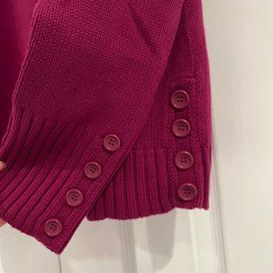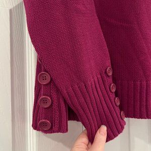 Thick sweater in a deep berry color has button details on each side of the body and on the sleeves. Like new. 100% cotton. Machine washable.