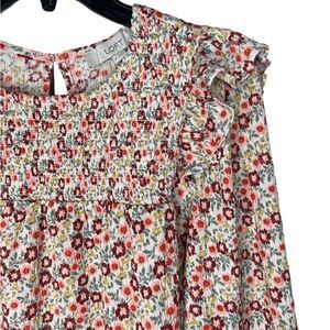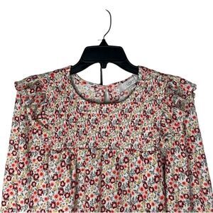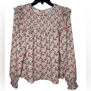 Loft Cream/Red/Green Long Sleeve Smocked Floral Ruffle Blouse Size Small