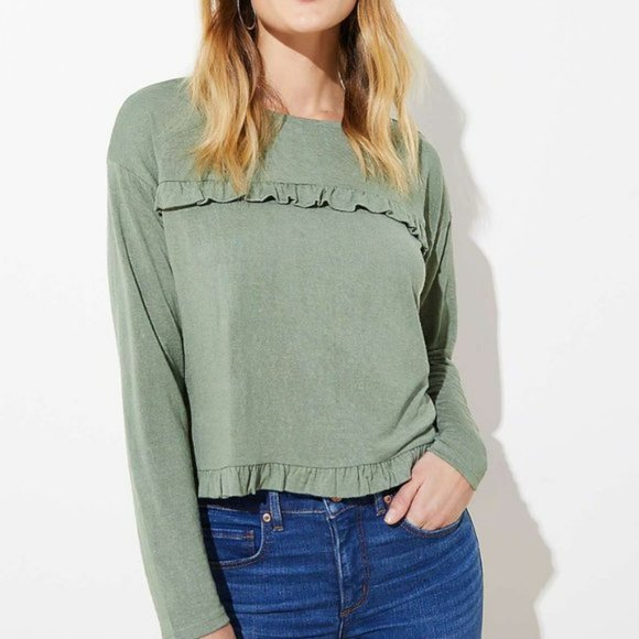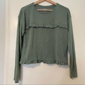 Modal / poly blend knit fabric, super soft. Crop styling. ruffle at chest and bottom hem. Festive for Spring and fun.