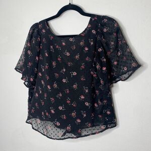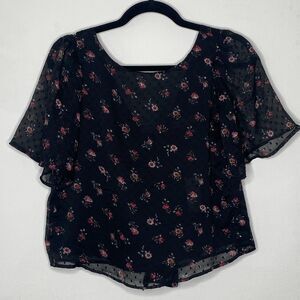 NWT Loft Black Floral Clip Dot Print Cropped Top Round Neck Short Sleeves V-Back With Ties