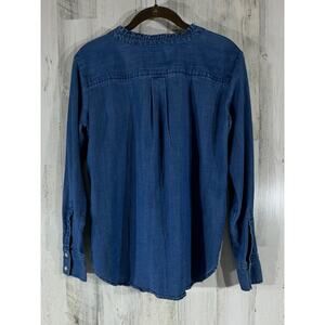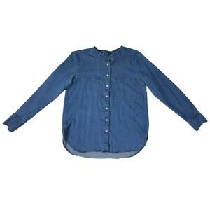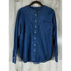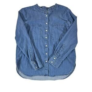 Loft Denim Chambray Button Up Shirt Size Medium Chest Pockets Ruffle Neck