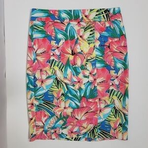 Loft denim pencil skirt with a floral hibiscus and birds print in a women's Size 0