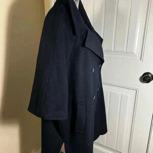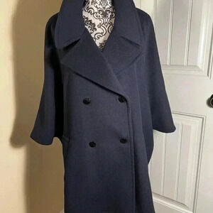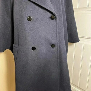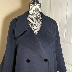 Navy blue Loft wool, unlined, double breasted cape with 4 black buttons, and front pockets with a shirt tail hem.