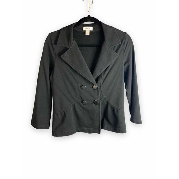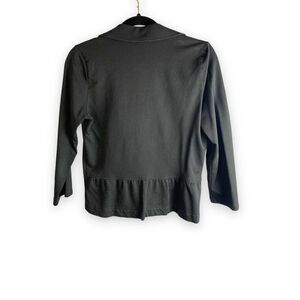 Black Double Breasted, 4 buttons, subtle ruffle bottom, 3-4 sleeves, soft and slightly stretchy short blazer.