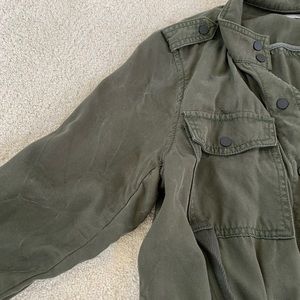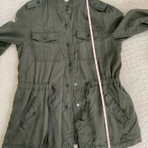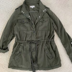 LOFT Drawstring utility jacket in good condition. Very soft washed texture. Perfect for layering and very versatile. Roll tab sleeves, four front pockets with button closure, and drawstring waist. Color is called “dark caper” and style number is 475567. Measures approximately 18” from armpit to armpit and 27” from shoulder to hem.