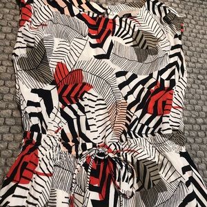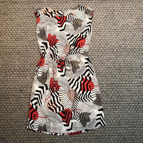 Beautiful color and pattern dress from Loft. Is a thin material but does have a liner. Has an adjustable waist with drawstrings.