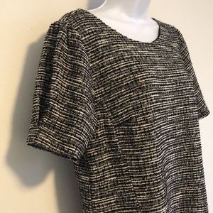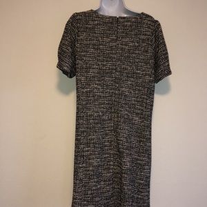 Black and white Tweed Fully Lined, Shift Dress. Featuring Short Sleeve with pleat. Rounded Neckline.with Back Zipp. Hem slightly above knee three buttons to botton of dress. Never worn!