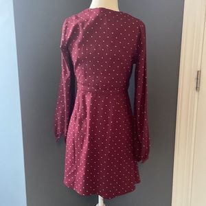 Burgundy wrap dress with small stars. Ties on side and has long sleeves. Never worn.