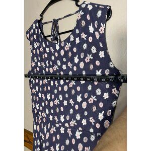 Lightweight comfortable swingy dress, dusty purply gray with muted florals, sleeveless, lined bodice, back zip & ties, full skirt.
