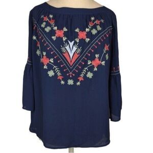 Loft Embroidered Bell Sleeve Boat neck Lightweight Navy Blouse XS