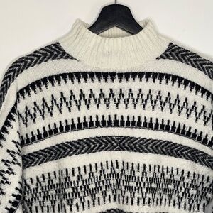 Mock neck, dolman sleeves, contrasting black and white pattern. Nylon/Acrylic/Wool blend.