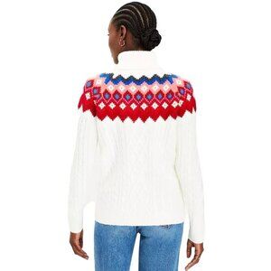 This Loft sweater combines intricate Fair Isle patterns with cozy cable knit texture. The acrylic and nylon wool blend ensures warmth and comfort. Winter White Colorful Fairisle Pattern, Retail $80