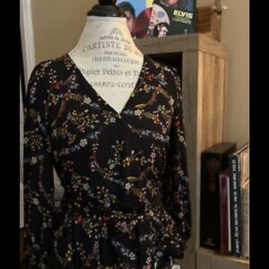 Elevate your style with this chic floral black wrap top. Perfect for any occasion, it offers a flattering fit and elegant design. Measurements in photos