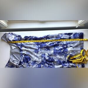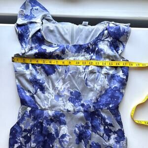 This Loft dress is a gray and blue floral print, with short flutter sleeves. It is a sheath style that comes in at the waist. It is in very good condition and a size 6.