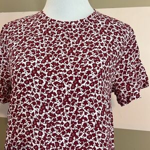Floral flounce swing dress with bottom ruffle trim, round neck, short sleeved with button keyhole.