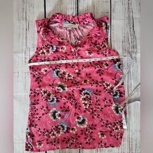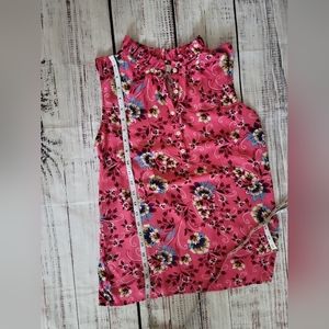 XXS rufflw shell, pink with floral print. Buttons 3/4 down the front. Really good used condition smoke-free home.