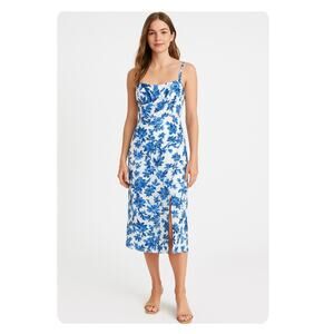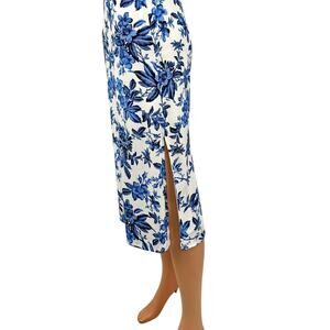 This Loft petite dress features a romantic sweetheart neckline with a vintage-inspired milkmaid-style bodice featuring a ruched bust that transitions into a figure-flattering waistline panel and a midi length skirt with a side slit for ease of movement. Designed in a crisp white background with a romantic, vintage-inspired cobalt blue floral print, it is fully lined and finished with a hidden back zipper.