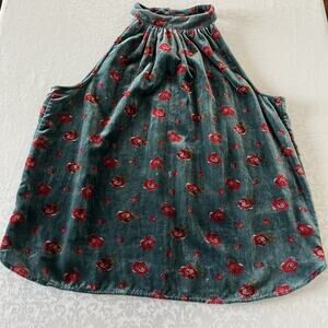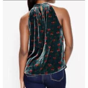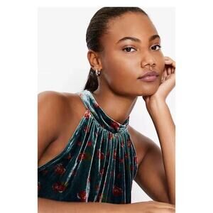 Loft Floral Velvet Shirred Halter Top Women's Medium Green Red Roses