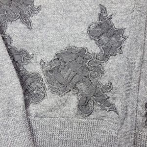Beautiful gray cardigan with sheer flower detail at bottom. There are two small holes on one sleeve. See pics. Merino wool and Acrylic.