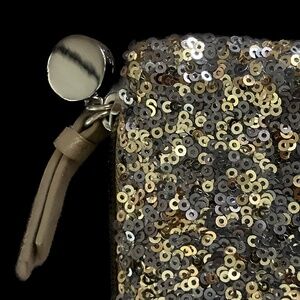 This purse is super cute, with sparkling sequins and a zipper closure. The zipper ornament has the words LIVE, LOVE, and LOFT. Perfect for weddings, parties, and more. Also, makes a great gift for birthdays and holidays. This purse is small, about four (4) inches wide and six (6) inches long. It has room for lipstick, keys, and credit cards. This purse is gently used and in good condition.