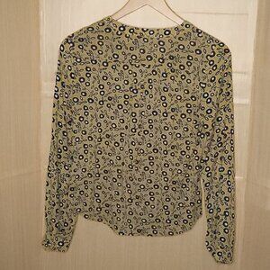 Loft Gold navy blue floral knit button front long sleeve shirt medium. Gently used condition. Measurements are: 25 ½" sleeve, 25” from shoulder to hem, and 21 ½" armpit to armpit.